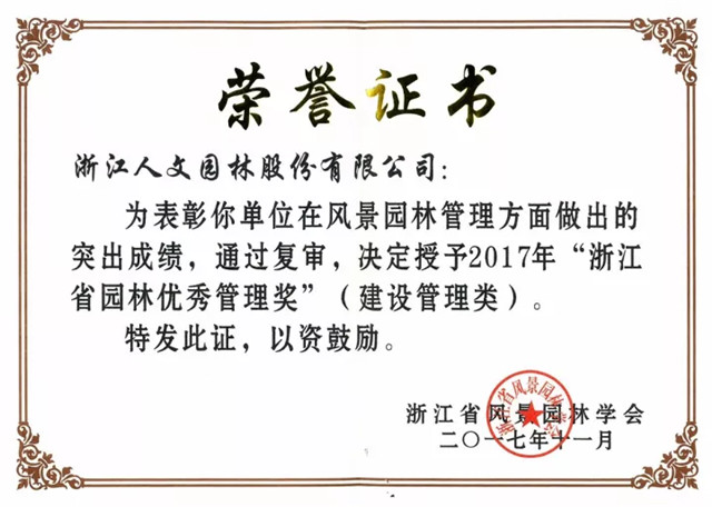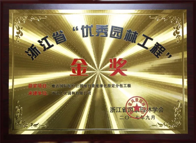 “雅達(dá)國際醫(yī)療公園項(xiàng)目景觀綠化指定分包工程”、“鄭州怡商花園式商務(wù)會(huì)館項(xiàng)目綠化及硬質(zhì)景觀工程一標(biāo)段”榮獲2017年度浙江省“優(yōu)秀園林工程”金獎(jiǎng);
