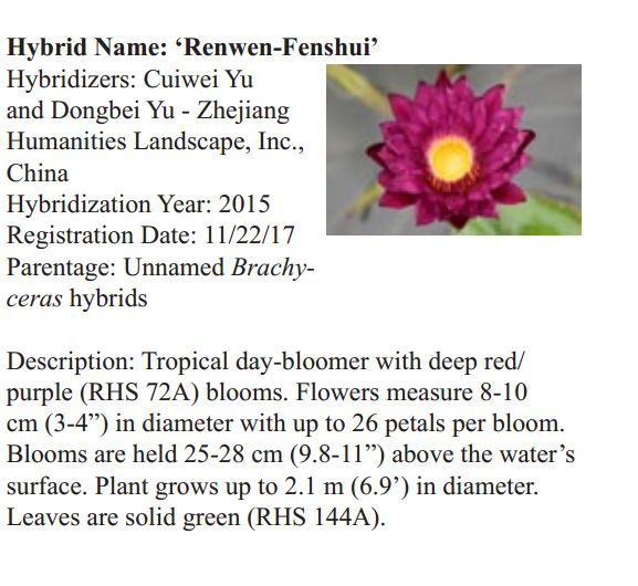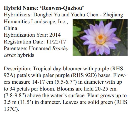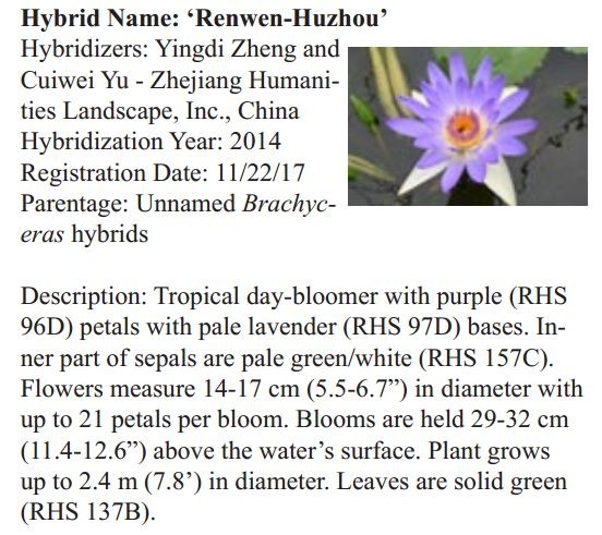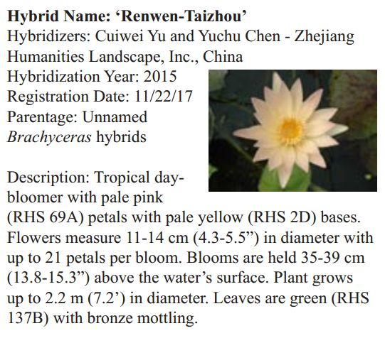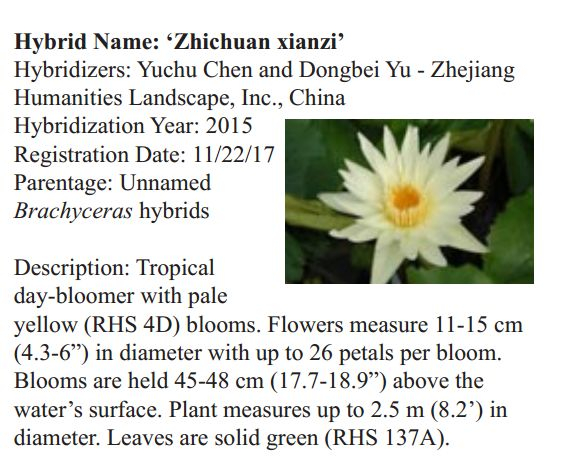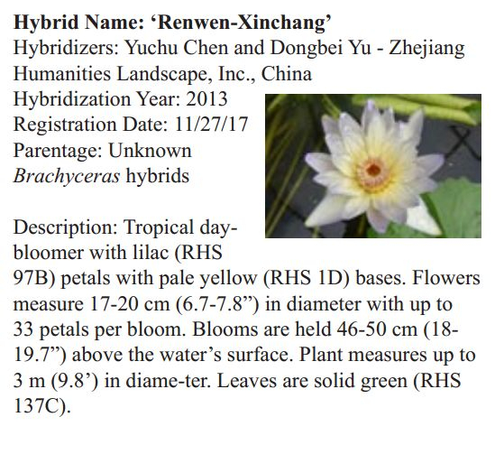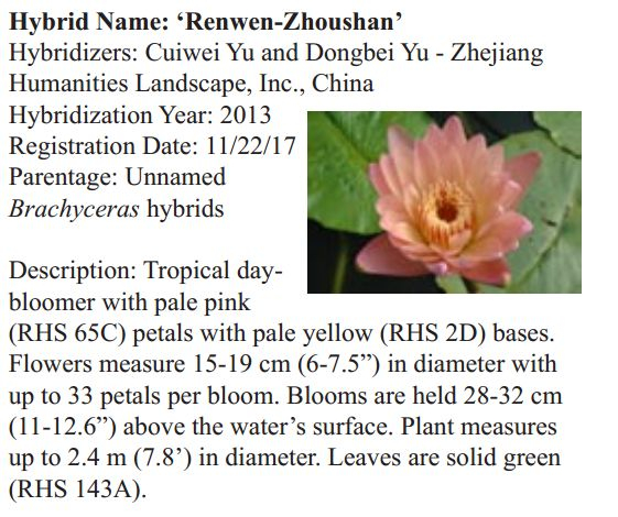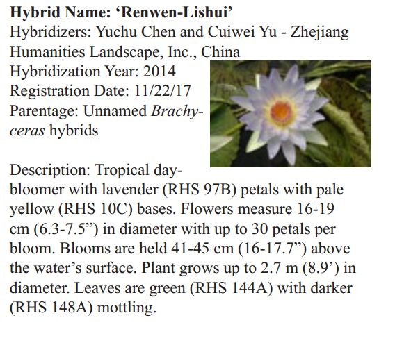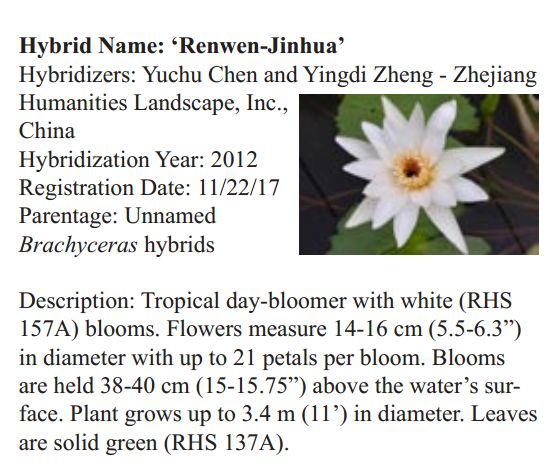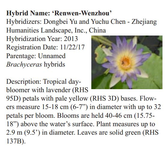 2018年1月19日,人文園林副總裁陳煜初收到美國《Water Garden Journal》雜志社Kathy發(fā)來的電子版IWGS Water Garden Journal Winter 2017-18。雜志報道了人文園林睡蓮屬國際登錄的10個新品種,蓮屬國際登錄的8個新品種,共計18個。加上此前獲得的新品種國際登錄,目前人文園林總共擁有20個睡蓮屬新品種國際登錄、35個蓮屬新品種國際登錄和1個鳶尾國際登錄。