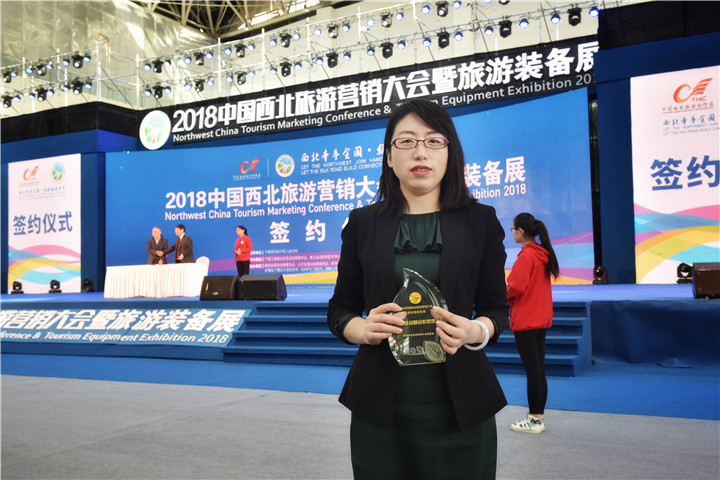 寧夏旅游發(fā)展委國內(nèi)處副調(diào)研員儀秀江(中)為獲獎單位頒獎,人文園林副總裁吳秋霞(右)代表公司領(lǐng)獎