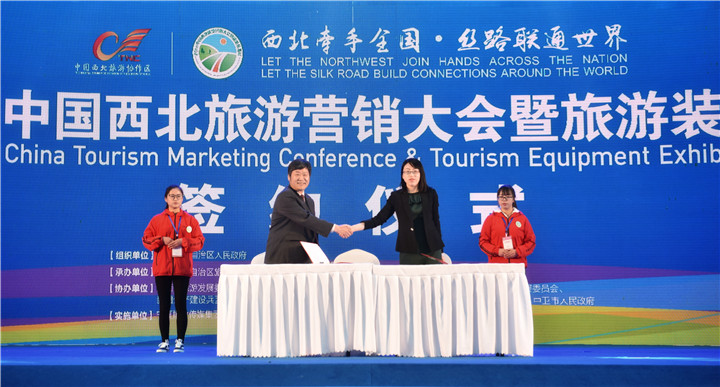 西北旅游協(xié)作區(qū)秘書長王曉民(左)與吳秋霞副總裁(右)代表雙方簽約