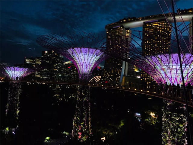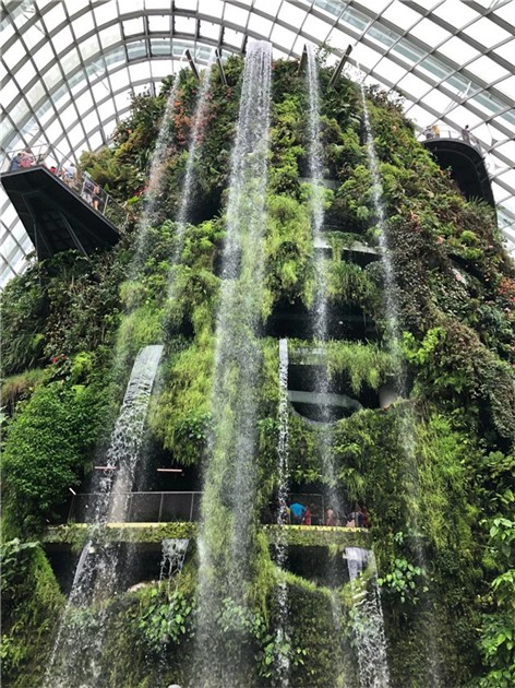 濱海灣花園設(shè)計(jì)集中了立體綠化的最新高科技手段。南花園正中央的幾棵巨型擎天大樹巍然聳立,分別介于 9~16 層樓高。云霧林是濱海灣花園的另一大特色,35m 高的蒼翠云山煙霧繚繞,宛若仙境,全球最高的室內(nèi)瀑布在此飛流直下。花園還囊括逾 25 萬(wàn)棵珍稀植物。