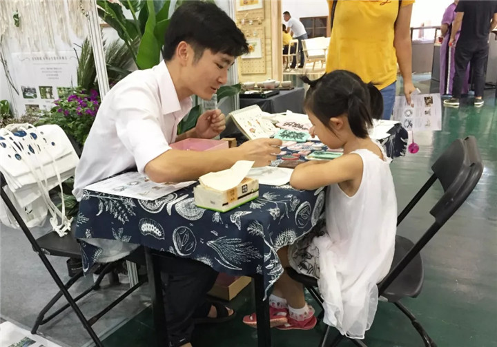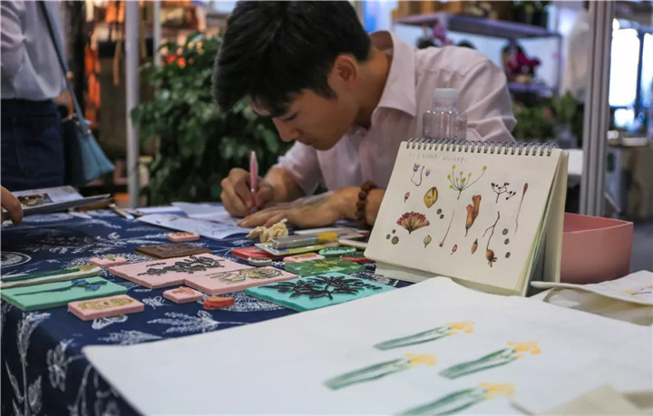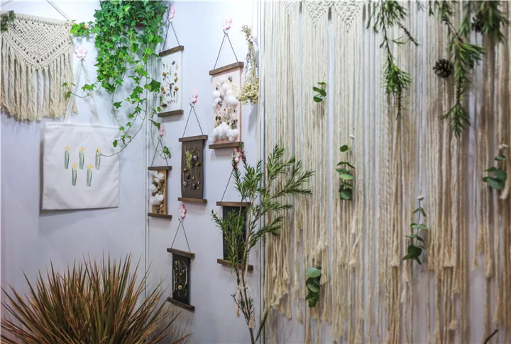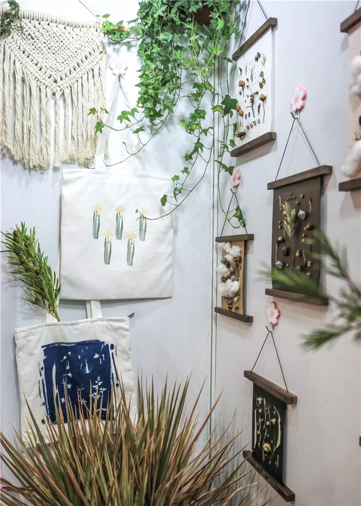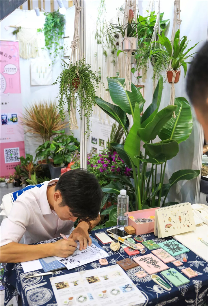本次參展,花點園藝精心布置,主要包括三個小分區(qū)——綠植鮮花區(qū)、植物手作產(chǎn)品區(qū)和手作體驗區(qū),除了精品植物盆栽、鮮花的展示,植物種植、植物養(yǎng)護小知識的分享,還有植物手繪筆記、藍曬、橡皮章雕刻轉(zhuǎn)印等有趣的植物手作活動,豐富多彩的形式,無一不在訴說著植物在家居生活中的美好。