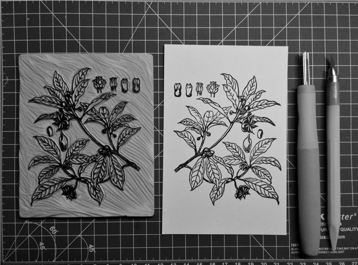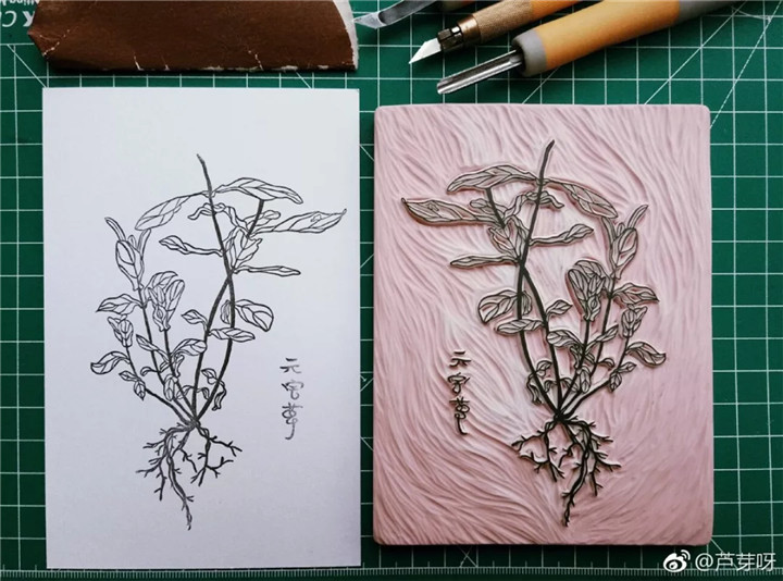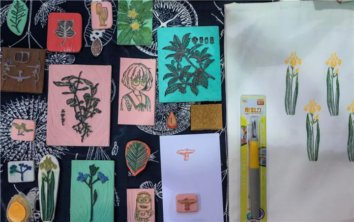 使用小型雕刻刀具在專用于刻章的橡皮磚上進行陰刻或陽刻,制作出可反復(fù)蓋印的圖案的一種手作形式。因材質(zhì)關(guān)系,手刻橡皮章比石刻、木刻快很多,也不需復(fù)雜的技巧,幾乎人人可以輕易上手,章的表現(xiàn)內(nèi)容也非常廣泛。