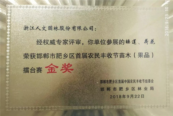 為落實設(shè)立“中國農(nóng)民豐收節(jié)”精神,響應(yīng)在全國開展農(nóng)民豐收節(jié)的號召,9月21日—22日,河北省邯鄲市肥鄉(xiāng)區(qū)舉辦了首屆農(nóng)民豐收節(jié)暨苗木花卉交流會,省內(nèi)外130余家園林綠化企業(yè)參展,浙江人文園林股份有限公司選送的睡蓮、荷花光彩奪目,眾望所歸,榮獲苗木(果品)擂臺賽金獎!