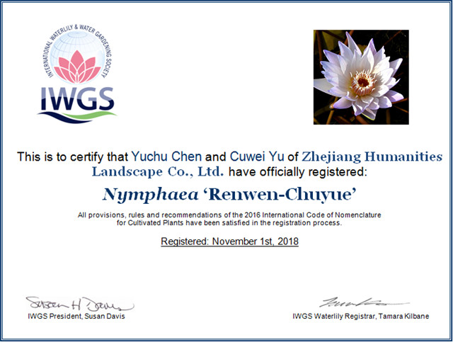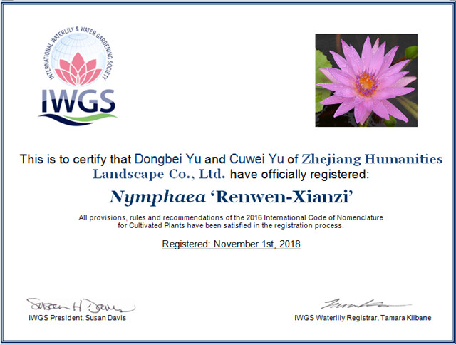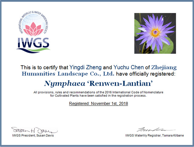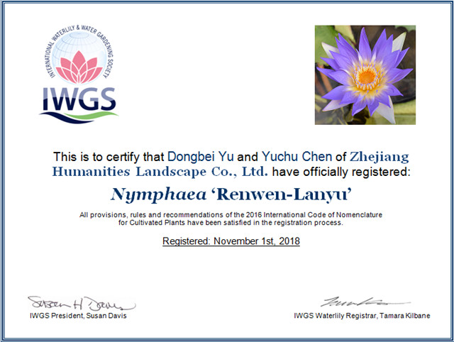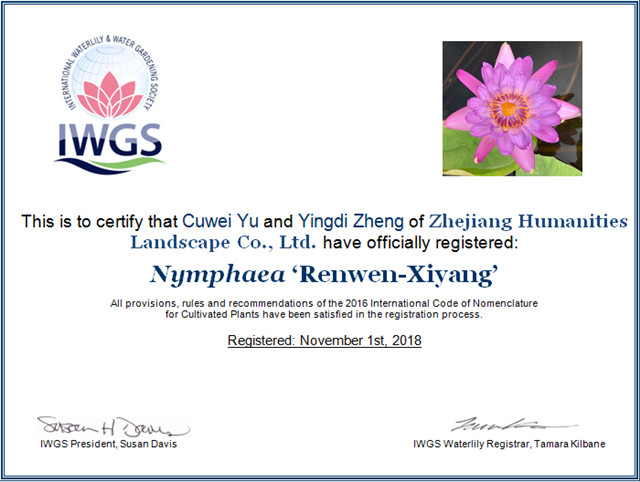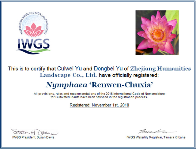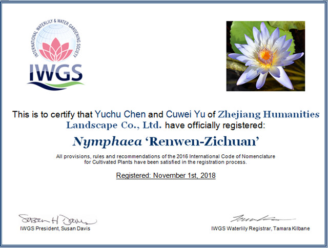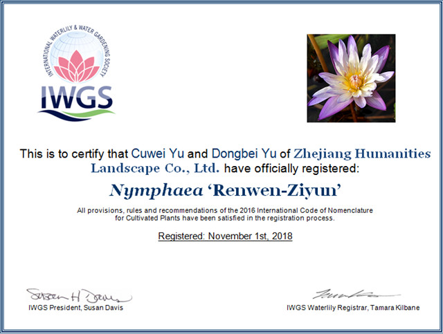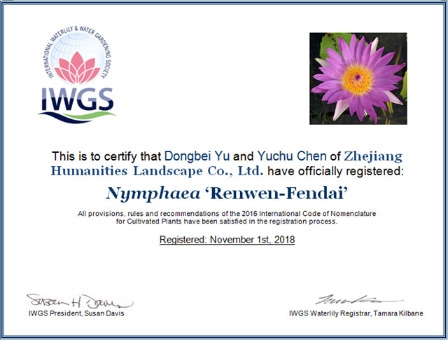 這是繼2016年和2017年之后,人文園林連續(xù)3年獲得10個睡蓮新品種國際登錄,目前公司睡蓮新品種總國際登錄數(shù)已達(dá)30個,2016年和2017年登錄數(shù)占兩年國際登錄總數(shù)的51.3%。