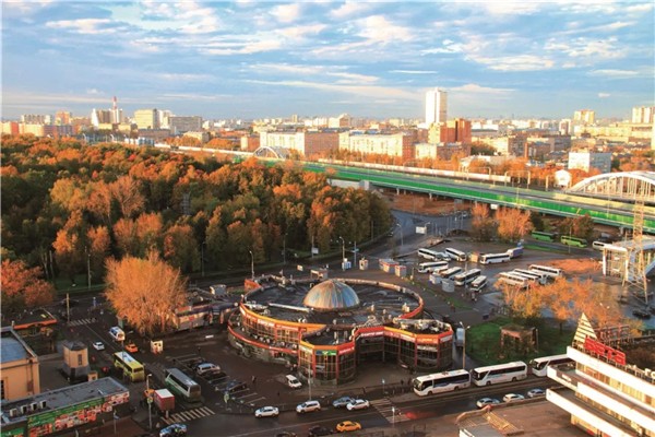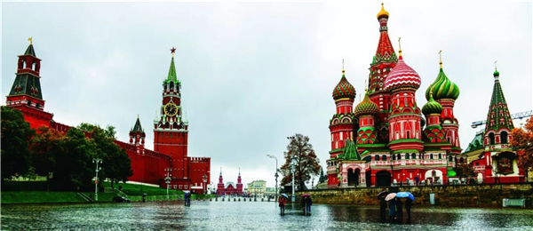 左為紅場警報(bào)大鼓鐘塔樓與斯帕斯(救世主)塔樓,右為圣瓦西里大教堂