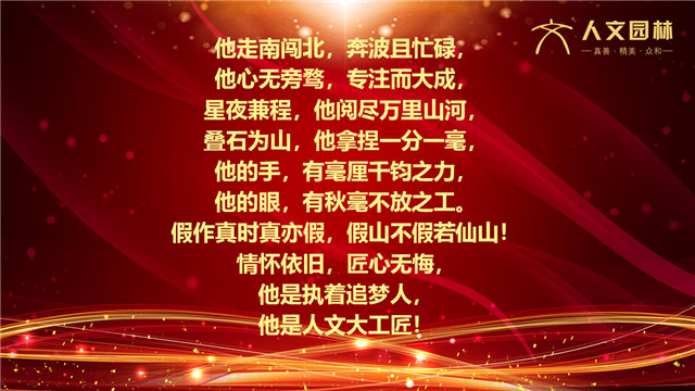 陳總強(qiáng)調(diào),園林是門(mén)實(shí)踐性很強(qiáng)的學(xué)科,真正的工匠,不是停留在嘴上,關(guān)鍵要能親自動(dòng)手,實(shí)實(shí)在在把東西做出來(lái)。不僅把事做好,還要把人做好,德要配位、配藝。張楊從高中畢業(yè)就開(kāi)始掇山置石,十幾年如一日,一心一意沉浸其中,其行業(yè)頂尖的技術(shù)水平,有目共睹。他對(duì)授藝恩師發(fā)自內(nèi)心的那份尊敬,更表明他做人的忠誠(chéng)度和責(zé)任心。他創(chuàng)作的南寧園博園東盟園東盟灣跌水瀑布,受到甲方高度評(píng)價(jià),被譽(yù)為“仙山”,大大提高了人文品牌的知名度和美譽(yù)度。人文園林第一個(gè)“人文工匠”稱號(hào),頒給張楊,實(shí)至名歸!陳總當(dāng)場(chǎng)宣布,任命張楊為總裁助理,并表示從張楊開(kāi)始,以后只要評(píng)上“人文工匠”,年薪增加十萬(wàn)!