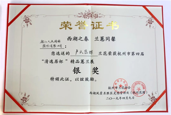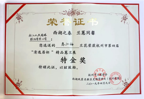 正是西湖四月天,桃紅柳綠,百花盛開,如詩如畫。年初的杭州市民蘭花節(jié)熱鬧勁剛過,4月9日,在和煦的春風(fēng)和幽幽的蘭香中,江南古典名園郭莊又迎來了“西湖之春 蘭蕙同馨”2019第四屆中國杭州蕙蘭精品展的開幕。開幕式上揭曉了本次蕙蘭展的獲獎(jiǎng)名單,浙江人文園林股份有限公司的展品“春江梅”一舉奪得特金獎(jiǎng),展品“盧氏蕊蝶”榮獲銀獎(jiǎng),副總裁錢茜萍出席開幕式并代表公司領(lǐng)獎(jiǎng)。