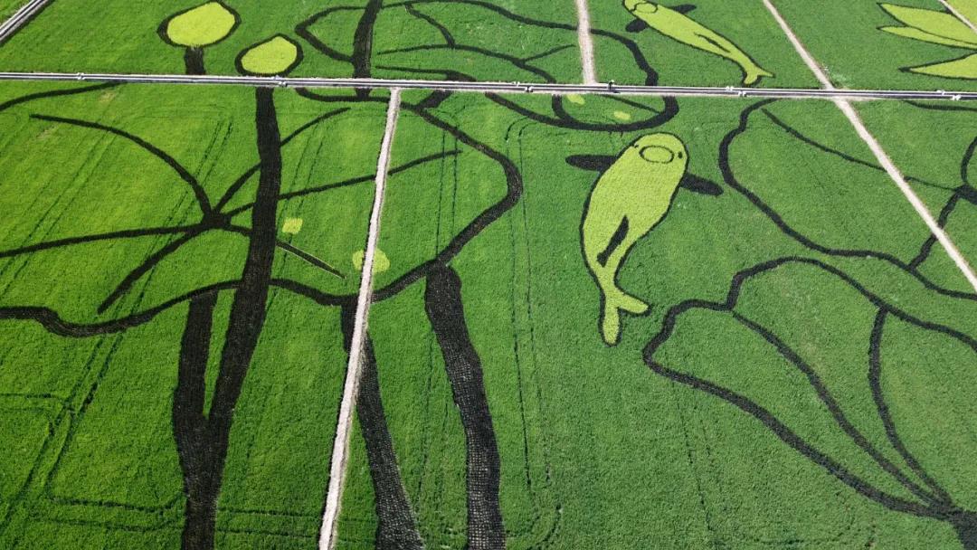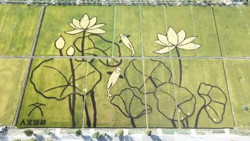 設(shè)計(jì)思路:稻田畫位于杭州西湖西側(cè),因而取荷花與鯉魚的西湖特色元素,據(jù)漢樂府詩《江南可采蓮》描述的意境,通過彩色水稻藝術(shù)化的創(chuàng)作了這副《魚戲蓮葉圖》?!遏~戲蓮葉圖》的圖畫中,一對鯉魚像夫妻一樣向上游,逆流而上;兩朵開花的荷花和兩朵未開花的荷包,兩條大鯉魚和六片荷葉,成雙成對的水滴,每一環(huán)節(jié)的設(shè)計(jì)都有“偶”意,荷花與鯉魚同時(shí)象征著連年有余、和和美美的吉祥寓意?!半p花雙蕾雙葉雙魚游,人文人藝人美人心齊。雙浦雙成,人文人才?!?,稻田畫用中國傳統(tǒng)水墨畫的方式,彩稻為墨、田為紙,將農(nóng)業(yè)園藝化,大地藝術(shù)化。