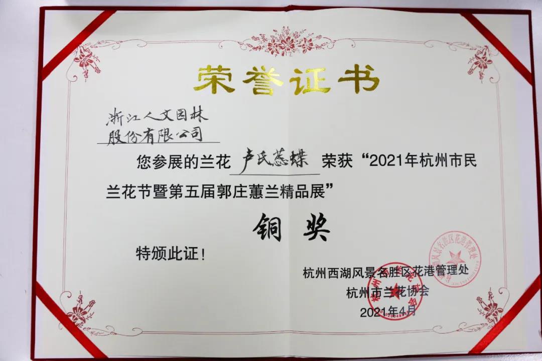 春至花開,時值賞花好時節(jié)。優(yōu)雅的春蘭姑娘們剛剛謝幕,這不,蕙蘭仙子又將登場。4月1日, “一展芳華?蘭韻杭城”——2021年杭州市民蘭花節(jié)暨第五屆郭莊蕙蘭精品展在郭莊開幕,現(xiàn)場共展出精品蕙蘭100余個品種,300多盆。開幕式上揭曉了本次蕙蘭展的獲獎名單,浙江人文園林股份有限公司的展品“春江梅”再次奪得金獎,展品“盧氏蕊蝶”榮獲銅獎,副總裁錢茜萍出席開幕式并代表公司領(lǐng)獎。