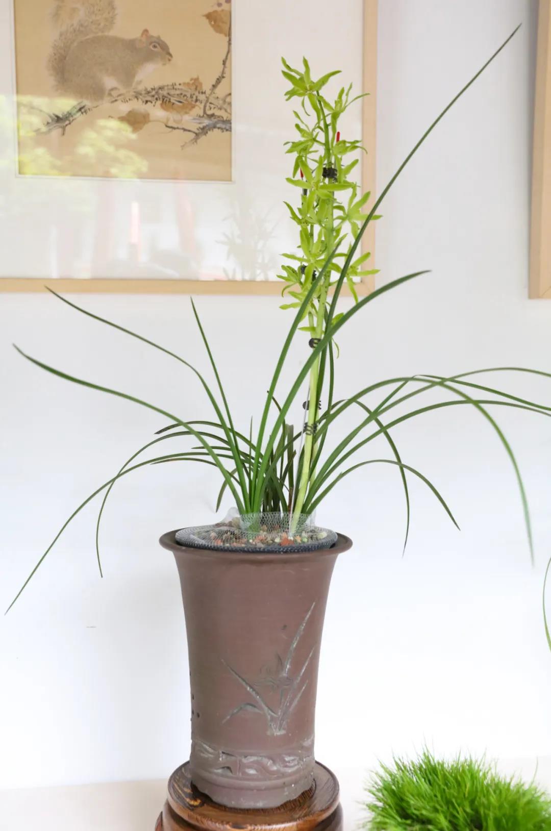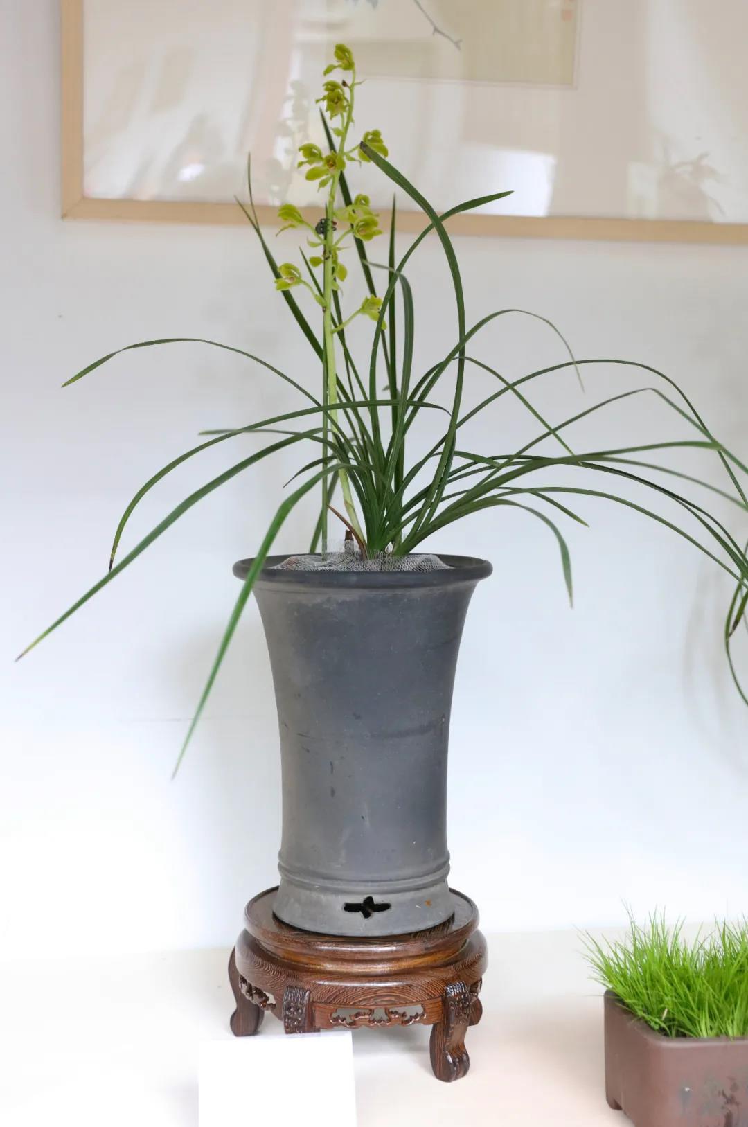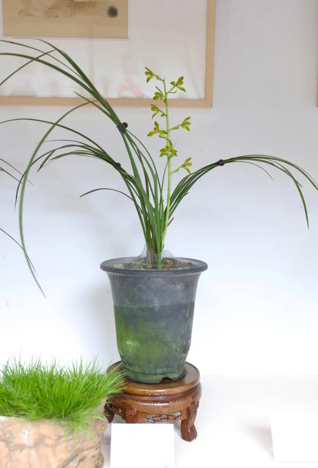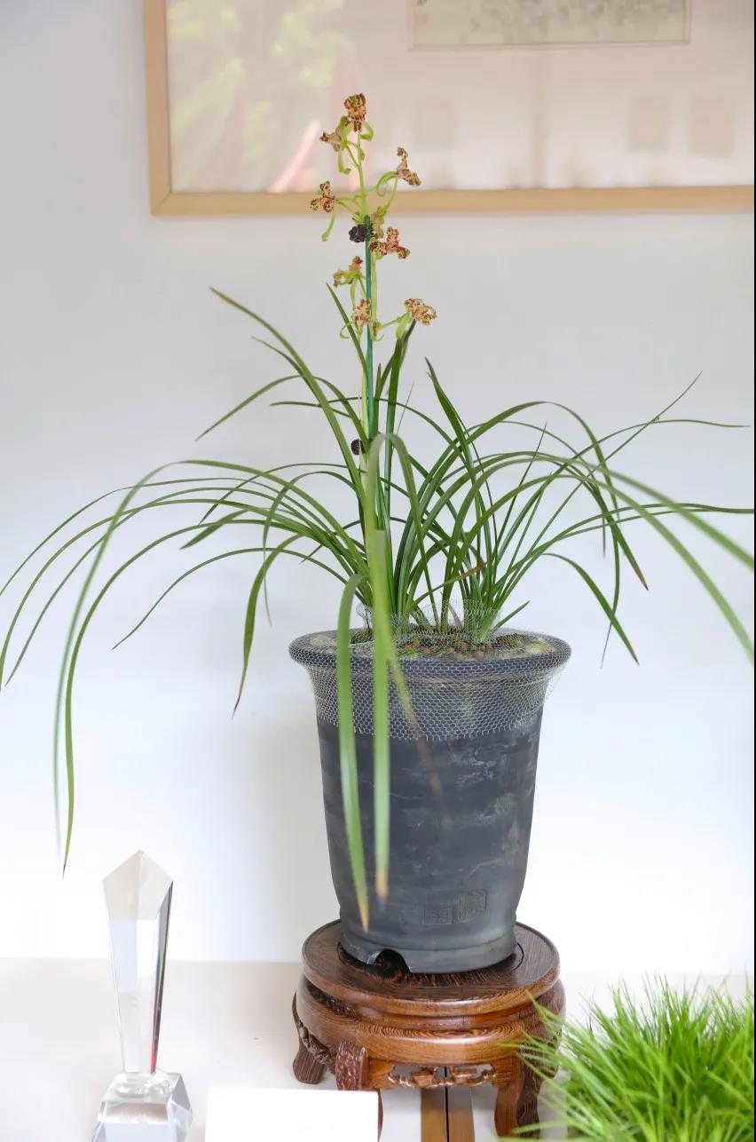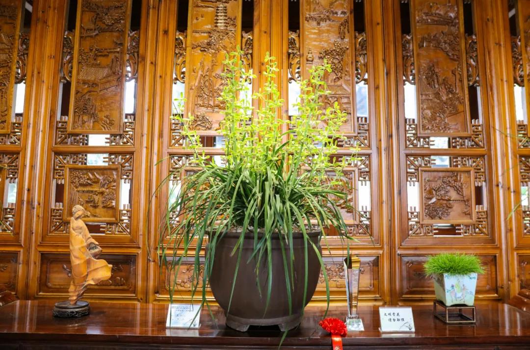 人文園林共有8盆蕙蘭共7個品種參展,分別為“春江梅”、“盧氏蕊蝶”、“翠豐梅” 、“蕩字”、“奇花復(fù)輪”、“云中鶴”和“大疊彩”,皆為人文園林董事長陳勝洪多年來采集、收藏的精品。因為對蘭花的熱愛與癡迷,30多年來,他傾力采集、培育了大量蘭花品種,“春江梅”這個品種采自桐廬山中,花桿翠綠出架,花守特好,葉姿半垂,幽香雅韻,如空谷佳人,陪伴他已有20多年。
