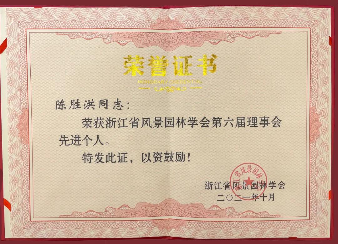 ▲浙江人文園林股份有限公司董事長陳勝洪榮獲浙江省風(fēng)景園林學(xué)會第六屆理事會先進(jìn)個人
