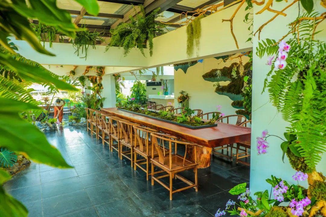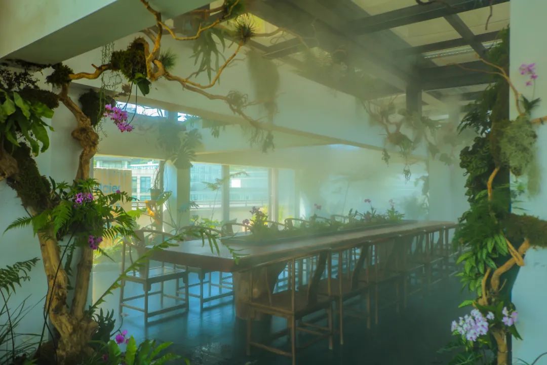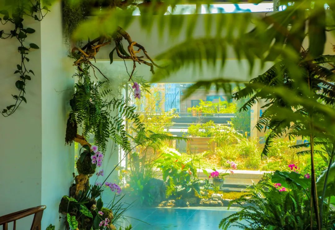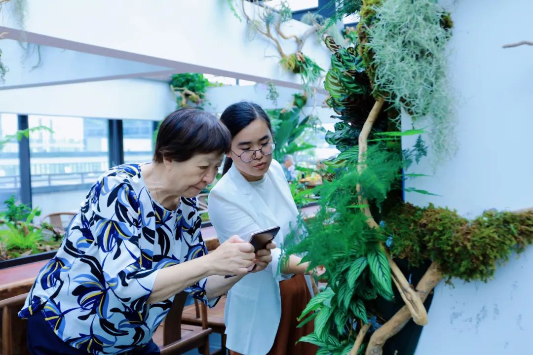 參會的專家顧問及副主任委員們還參觀了人文園林位于屋頂?shù)幕▓@。雖然杭州進(jìn)入了炎熱的夏季,但花園內(nèi)依然綠意盎然,行走在其間仿佛置身于雨林中。這里同時(shí)作為植物品種收集種植觀測區(qū),現(xiàn)已種植植物品種約400多種,其中包括睡蓮、鳶尾、蘭花、杜鵑、紫藤等人文園林特色植物。