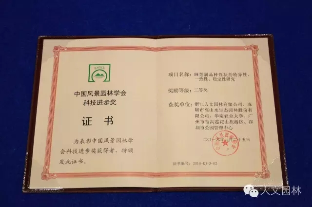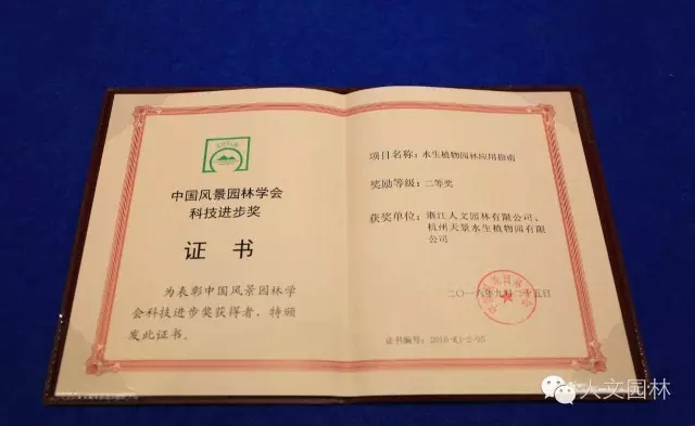 2016年9月23日~26日,2016中國風景園林學會年會在廣西南寧隆重召開,并頒發(fā)了2016中國風景園林學會科技進步獎,由浙江人文園林有限公司推出的“人文園林系列叢書”之《水生植物園林應(yīng)用指南》,獲得2016中國風景園林學會科技進步獎二等獎,浙江人文園林有限公司等單位共同研究的“睡蓮屬品種性狀的特異性、一致性、穩(wěn)定性研究”獲得2016中國風景園林學會科技進步獎三等獎。