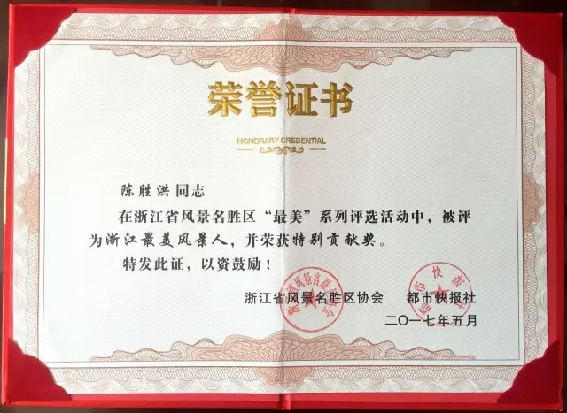 浙江省國家級(jí)風(fēng)景名勝區(qū)聯(lián)席會(huì)議暨景中村更新論壇于2017年5月24日-26日在浙江省天臺(tái)山風(fēng)景名勝區(qū)召開,會(huì)議議程之一是由浙江省風(fēng)景名勝區(qū)協(xié)會(huì)和都市快報(bào)聯(lián)合主辦的浙江省風(fēng)景名勝區(qū)“最美”系列評(píng)選活動(dòng)-浙江最美風(fēng)景人頒獎(jiǎng)儀式,經(jīng)各單位推薦、篩選、網(wǎng)絡(luò)投票、專家評(píng)議、網(wǎng)絡(luò)公示,現(xiàn)已落下帷幕,我司陳勝洪董事長榮獲“特別貢獻(xiàn)獎(jiǎng)”稱號(hào)。