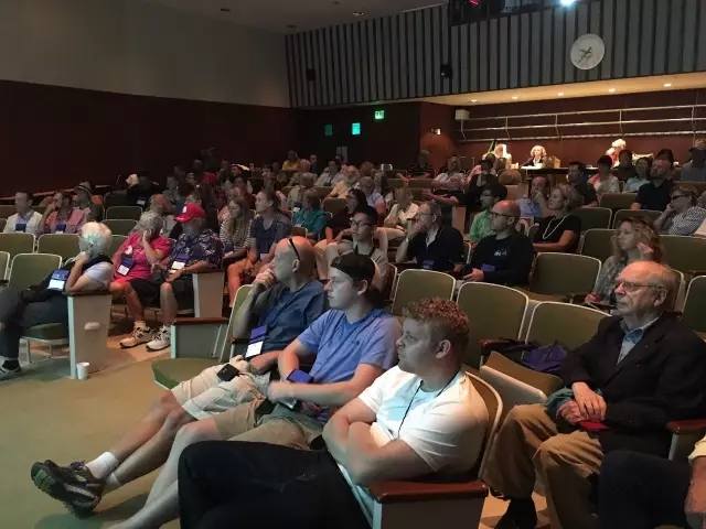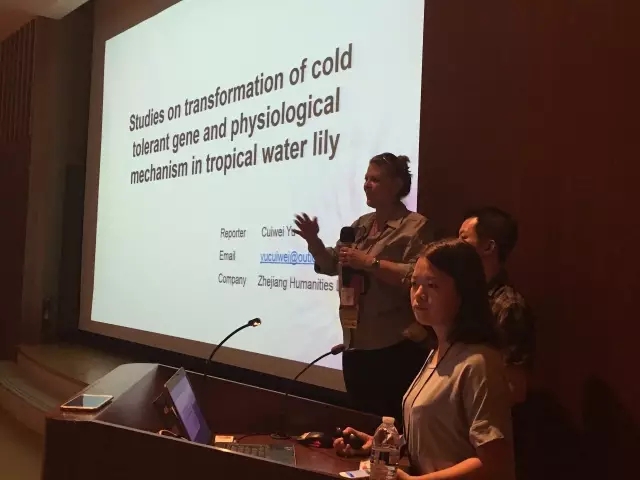 我司研究院院長陳煜初(左1)和IWGS主席(右1)交流 2017年8月9日-11日,國際睡蓮水景園藝協(xié)會(IWGS)年會在美國賓州著名的長木公園舉行,浙江人文園林股份有限公司研究院余翠薇研究員在年會上做了題為《熱帶睡蓮耐寒轉(zhuǎn)基因及耐寒生理研究》的報告,引起與會專家強烈興趣,共有英美等7位專家提問。 我司研究員余翠微在做報告 聚精會神聽報告的專家們 我司研究員余翠微在回答專家提問