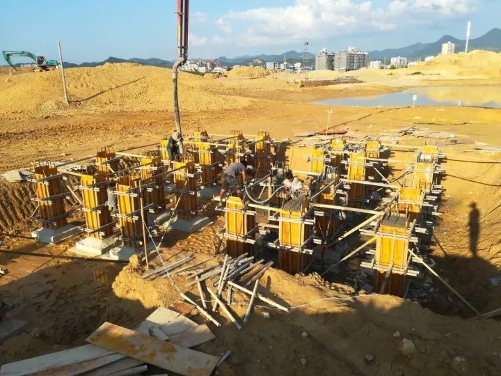 施工人員正在澆灌混凝土,平整地基。