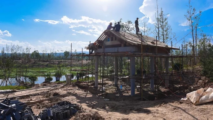 施工人員正在搭建涼亭,雖然汗水已濕透衣背,但他們?nèi)詧?jiān)守在崗位上。