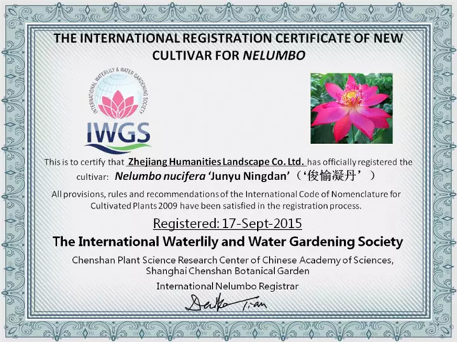 ‘俊愉凝丹’是我司子公司杭州天景水生植物園有限公司于2013年育成,該品種是因紀念我國園林界泰斗——陳俊愉院士而命名的,于陳俊愉院士誕辰98周年紀念日前夕2015年9月17日獲得蓮屬國際栽培品種登錄。在2016年春季新品種拍賣會上,該品種的2株種藕拍得人民幣11690元,寓意(陳俊愉)先生一路走好,由嘉禾大地園藝有限公司拍得。浙江人文園林股份有限公司將拍賣所得收入全部捐給北京林業(yè)大學陳俊愉教育基金會。